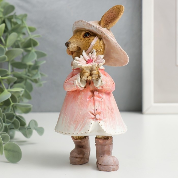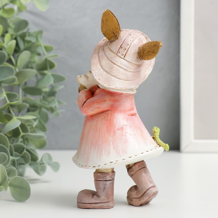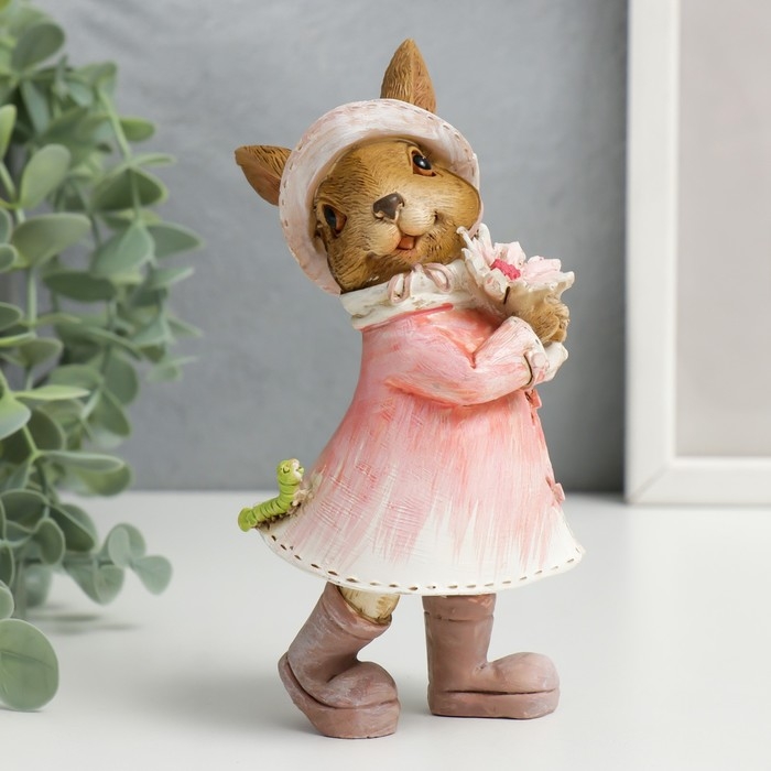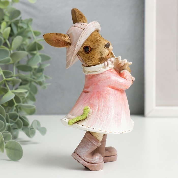 Сувенир полистоун "Зайка в шляпке и дождевике с цветком и гусеницей" 14,5х6,5х8 см