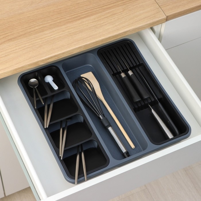 - Разделение лотка на 7 секций поможет вам легко разместить ножи, вилки и другие предметы кухонной утвари отдельно друг от друга.