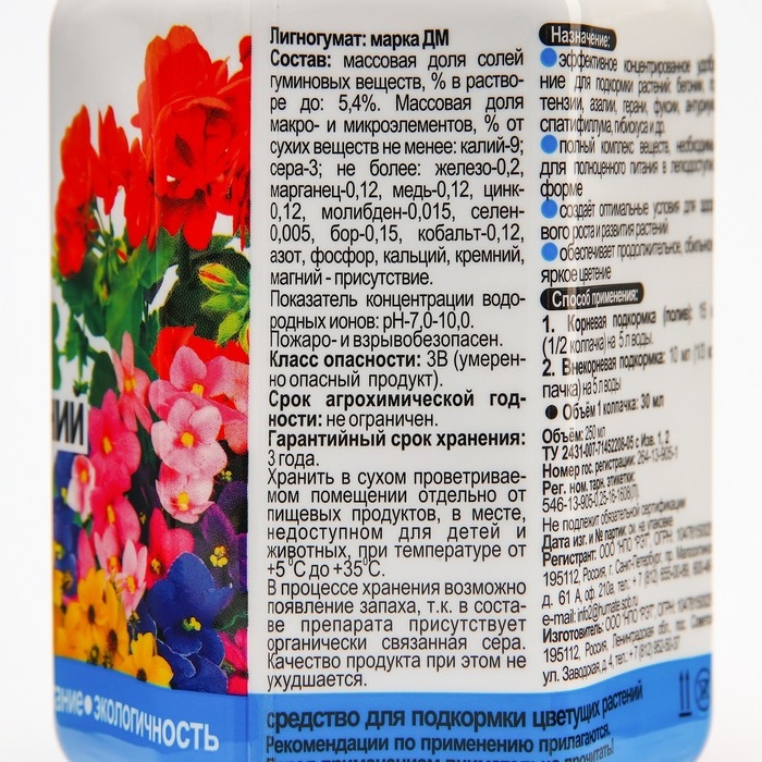 Удобрение содержит сбалансированный комплекс макро- и микроэлементов, необходимых для цветущих растений.