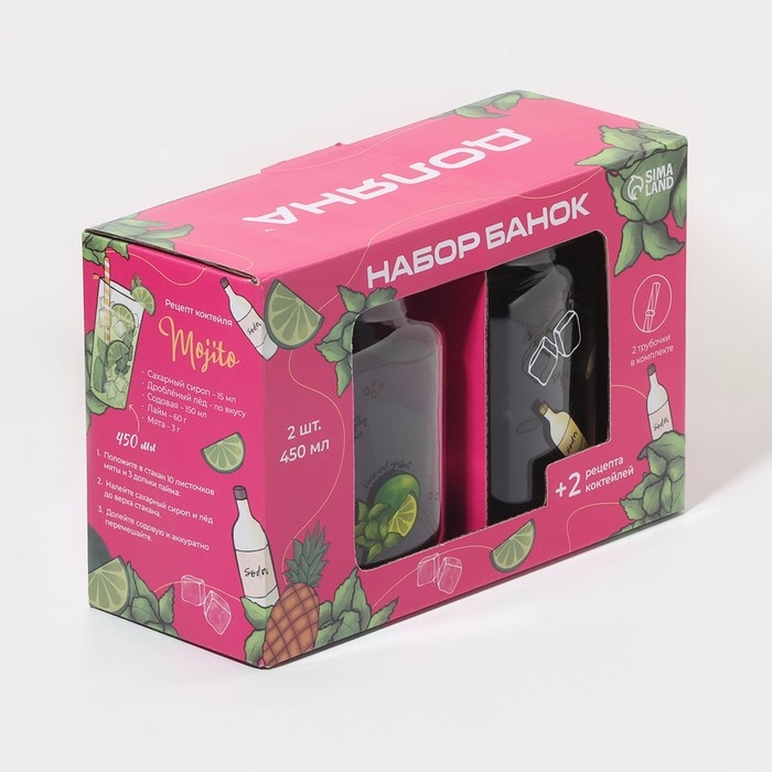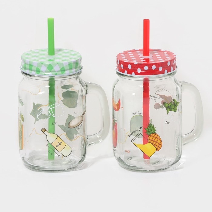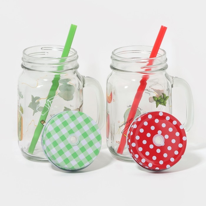 Набор банок стеклянных Доляна «Свежий бриз», 2 предмета: 2 банки с крышками и трубочками 450 мл