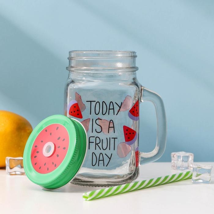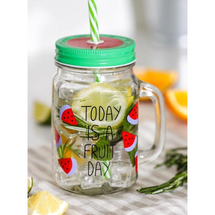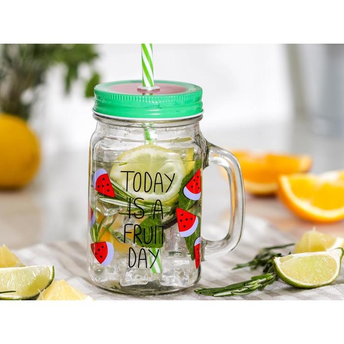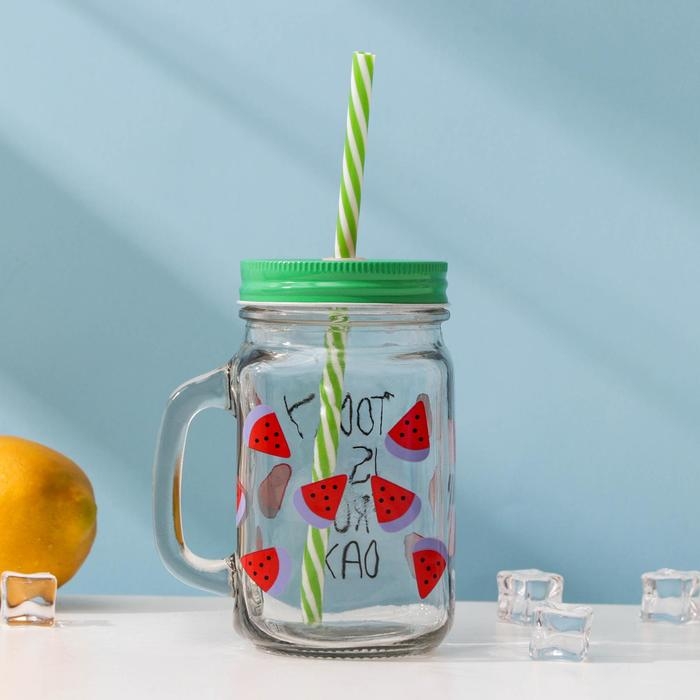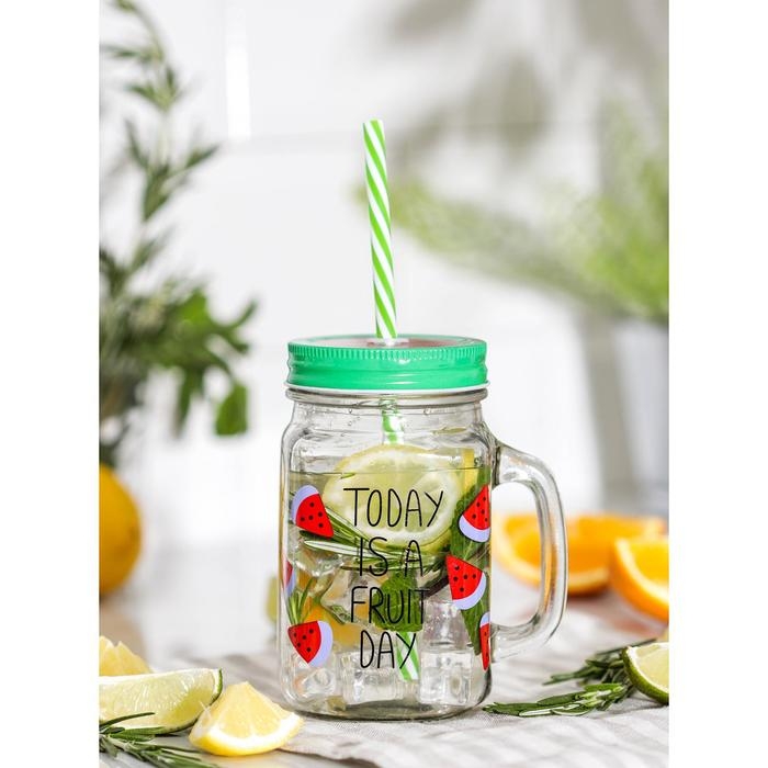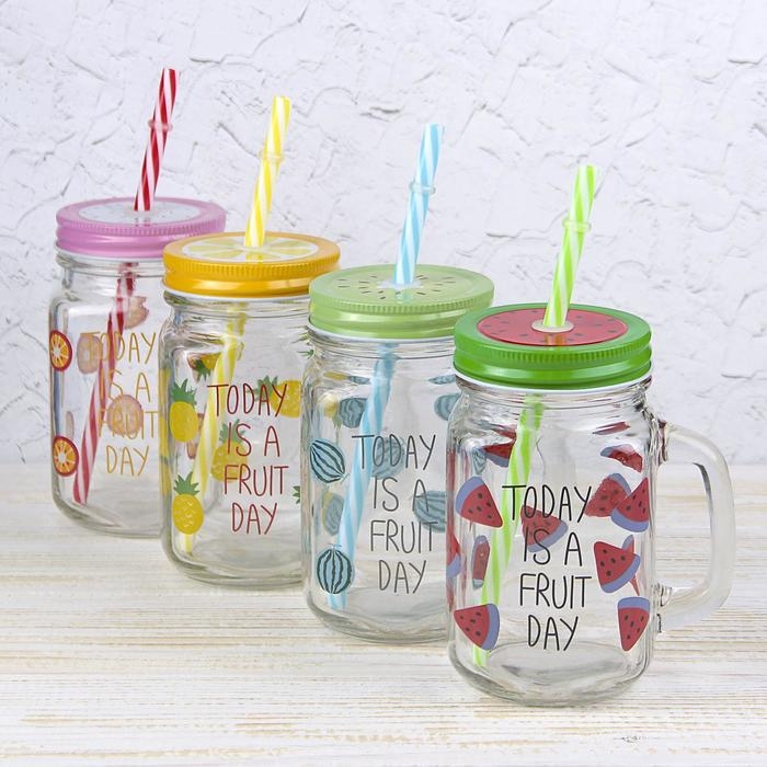 Банка стеклянная с крышкой и трубочкой Доляна «Счастливый день», 450 мл, 10,5×7,5×13 см, цвет МИКС