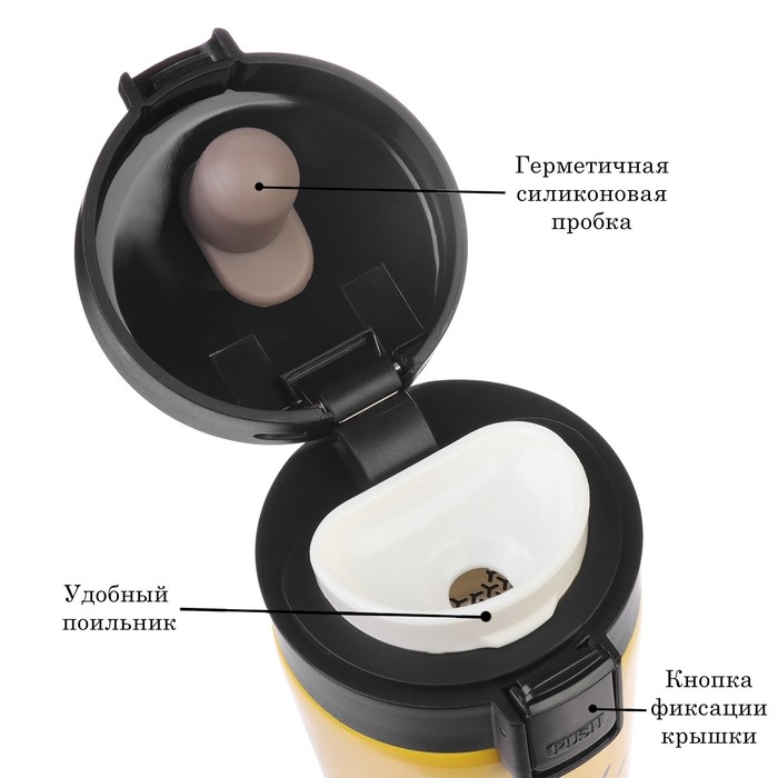 Термокружка сделана из нержавеющей стали марки 304, сконструирована по вакуумной технологии, с двойной стенкой, следовательно, долго держит тепло и не проливается. Снабжена откидывающейся крышкой, изготовленной из экологичного пищевого пластика, имеется кнопка с функцией блокировки, позволяющая с легкостью использовать термос одной рукой. На дне, термокружка имеет специальную прорезиненную основу, предотвращающую царапины на поверхностях.