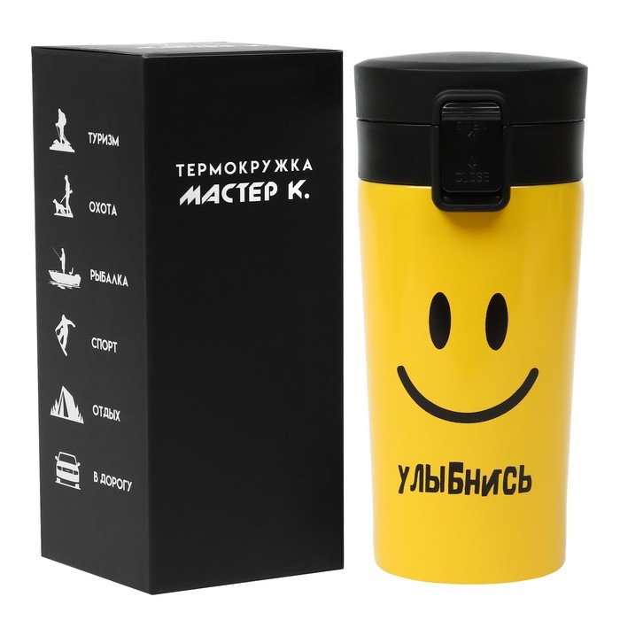 Термокружка для кофе и чая "Мастер К" идеальна для офиса, автомобиля, длительных прогулок и детям в школу. Благодаря специальному покрытию надежно лежит в руке.