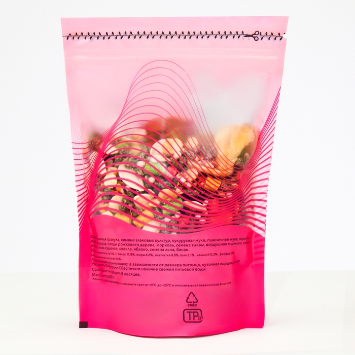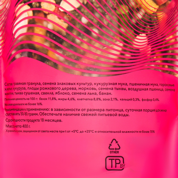 Травяная гранула, семена злаковых культур, кукурузная мука, пшеничная мука, гороховые хлопья, кукуруза, плоды рожкового дерева, морковь, семена тыквы, воздушная пшеница, семена конопли, тыква сушеная, свекла, яблоко, семена льна, банан.
