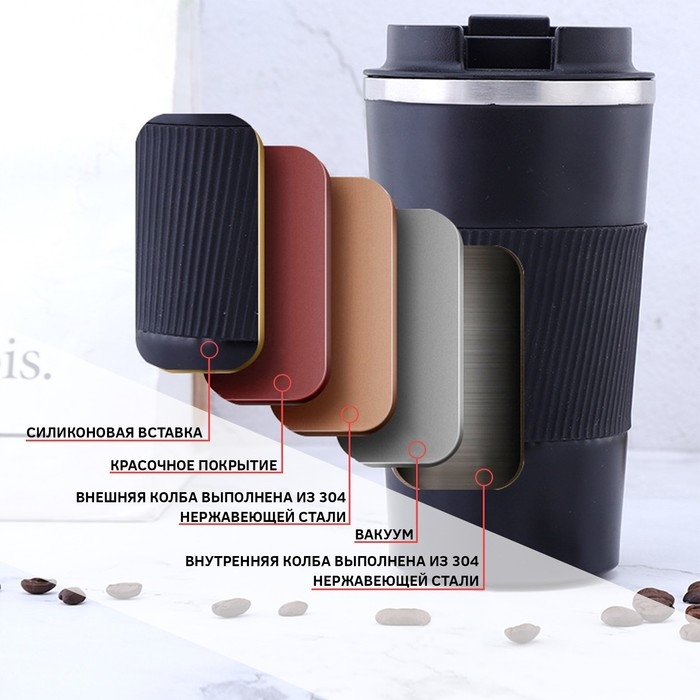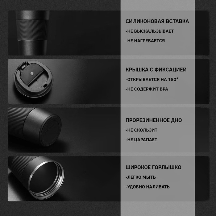 Термокружка выполнена из 304 нержавеющей стали, сконструирована по вакуумной технологии, с двойной стенкой, следовательно, долго держит тепло и не проливается. Снабжена откидывающейся крышкой на 180°, изготовленная из экологичного пищевого пластика, имеется фиксатор, возможность с легкостью использовать термокружку одной рукой. На дне, термокружка имеет специальную прорезиненную основу, предотвращающую царапины на поверхностях.