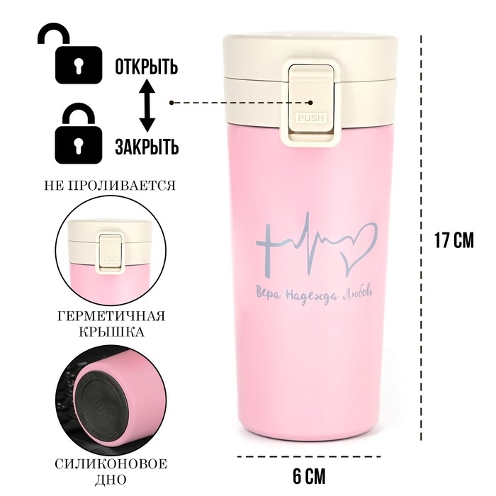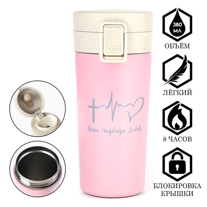 Термокружка сделана из нержавеющей стали марки 304, сконструирована по вакуумной технологии, с двойной стенкой, следовательно, долго держит тепло и не проливается. Снабжена откидывающейся крышкой, изготовленной из экологичного пищевого пластика, имеется кнопка с функцией блокировки, позволяющая с легкостью использовать термос одной рукой. На дне, термокружка имеет специальную прорезиненную основу, предотвращающую царапины на поверхностях.