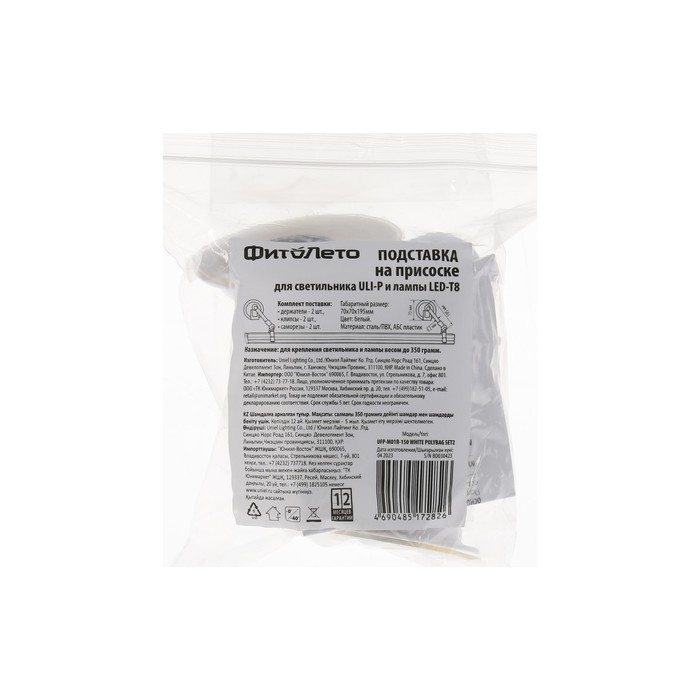 Подставка для светильника на присоске ULI-P и лампы LED-T8, длина 150 мм, Набор 2 ШТ, Белая