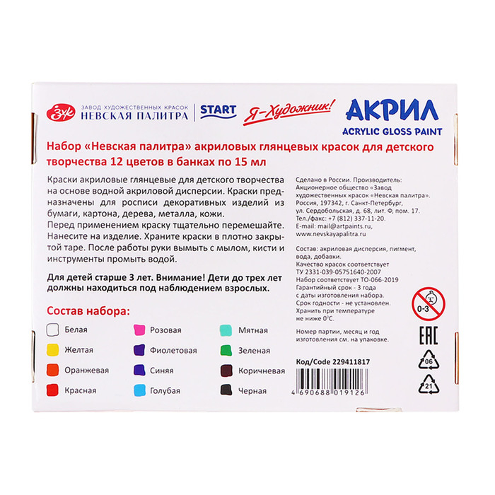 Краски для детского творчества "Я-Художник!" на основе водной акриловой дисперсии предназначены для росписи декоративных изделий из бумаги, картона, дерева, металла, кожи. Краски хорошо смешиваются, быстро высыхают. После высыхания приобретают глянцевый блеск, не смываются водой.