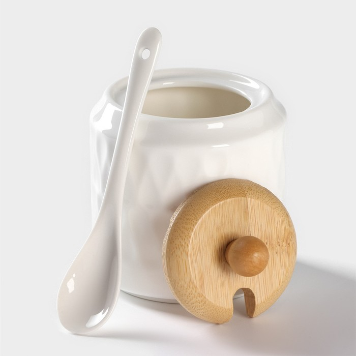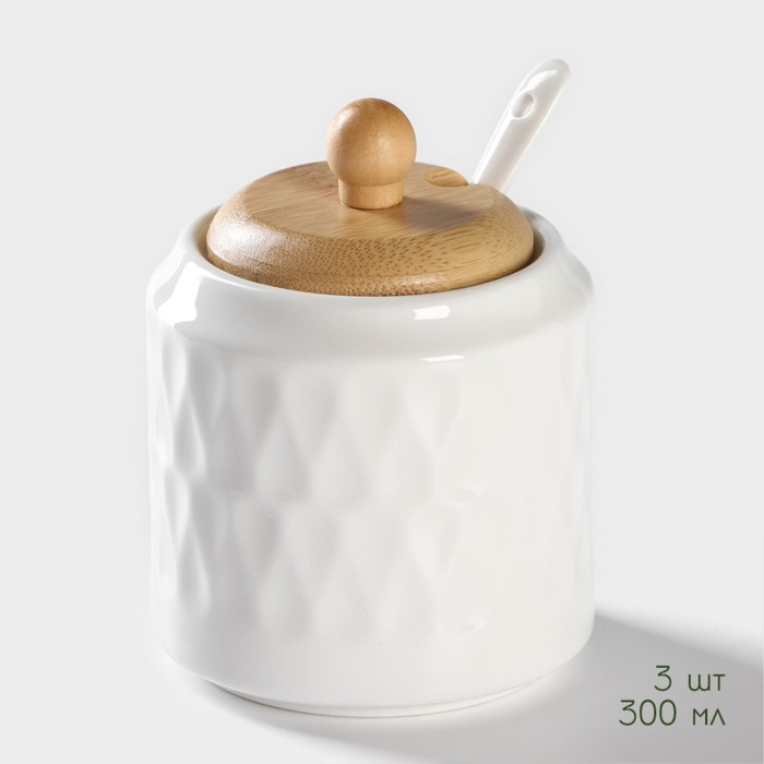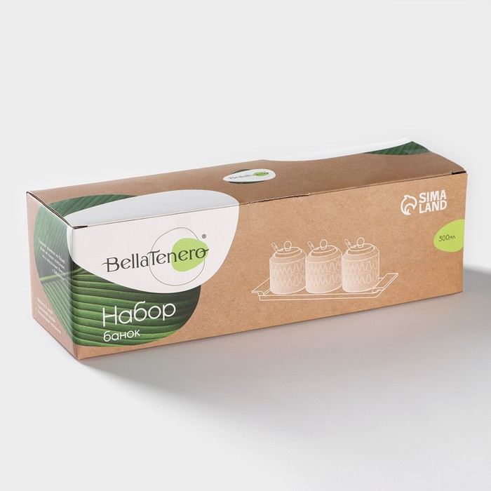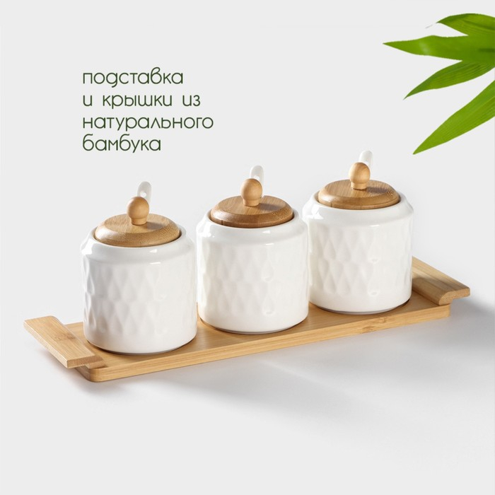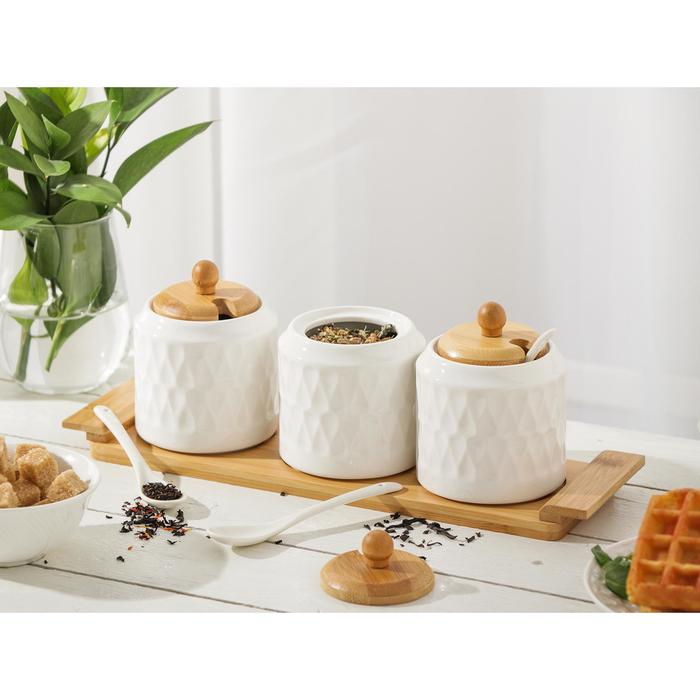 Набор банок фарфоровых для сыпучих продуктов на бамбуковой подставке BellaTenero «Тюльпан», 7 предметов: 3 банки 300 мл, 3 ложки, подставка, керамические, цвет белый