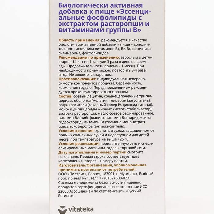 Биологически активная добавка к пище «Эссенциальные фофолипиды» с экстрактом расторопши и витаминами группы В содержит компоненты, способствующие восстановлению и защите клеток печени. В состав входит соевый лецитин - источник фосфолипидов, которые, встраиваясь в поврежденные мембраны, способствуют регенерации гепатоцитов. Также биологически активная добавка содержит экстракт расторопши, богатый силимарином. Это натуральное вещество является гепатопротектором и обладает выраженным антиоксидантным действием. Витамины группы В в составе подобраны с учетом их влияния на печень.