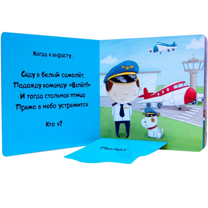 На каждом развороте малыш найдет загадку в стихах, отгадав ее и отогнув клапан, он узнает, кем мечтают стать герои книг, когда вырастут.