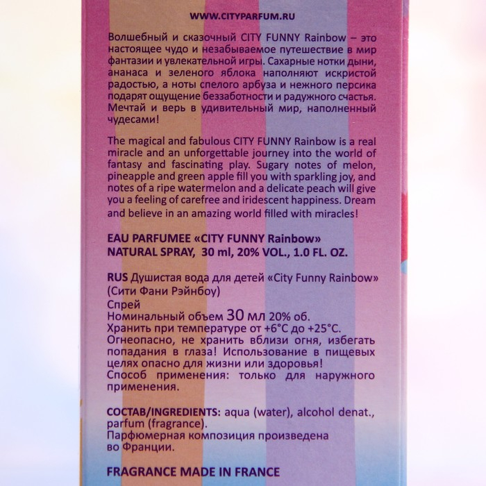 Волшебный и сказочный City Funny Rainbow – это настоящее чудо и незабываемое приключение в мир фантазии и увлекательной игры. Сахарные нотки дыни, ананаса и зеленого яблока наполняют искристой радостью, а ноты спелого арбуза и нежного персика подарят ощущение беззаботности и радужного счастья. Мечтай и верь в удивительный мир, наполненный чудесами!