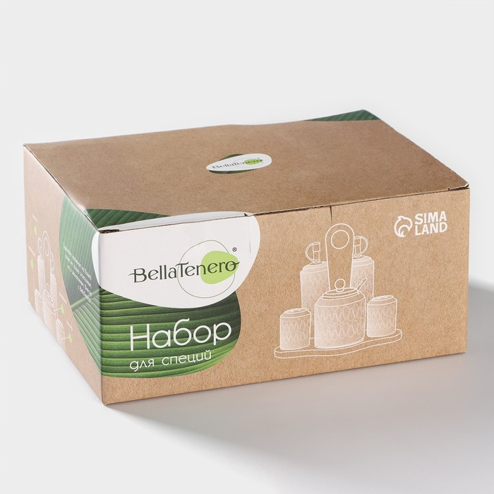 Набор фарфоровый для специй BellaTenero, 5 предметов: солонка 50 мл, перечница 50 мл, сахарница с ложкой 200 мл, подставка-держатель, цвет белый