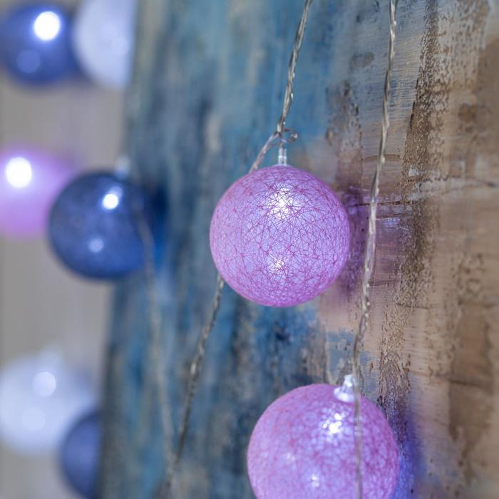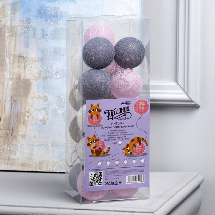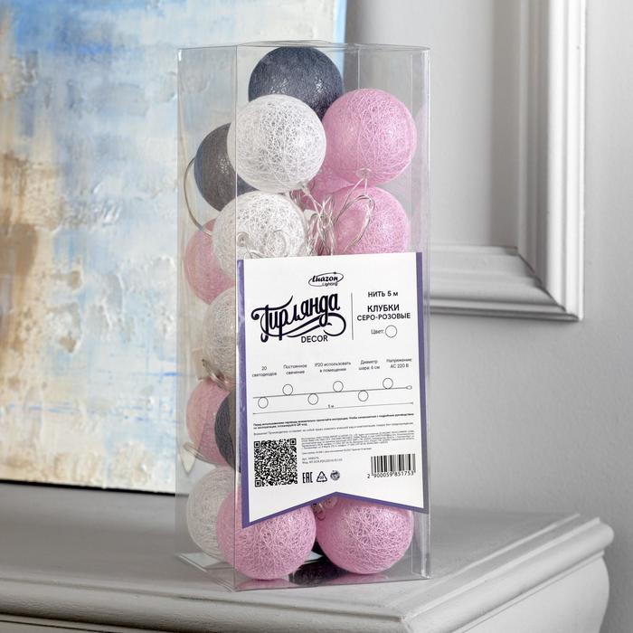 Гирлянда «Нить» 5 м с насадками «Клубки серо-розовые», IP20, прозрачная нить, 20 LED, свечение белое, 220 В