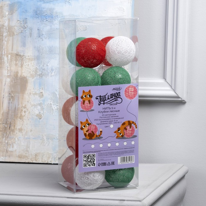 Гирлянда «Нить» 5 м с насадками «Клубки лесные», IP20, прозрачная нить, 20 LED, свечение белое, 220 В