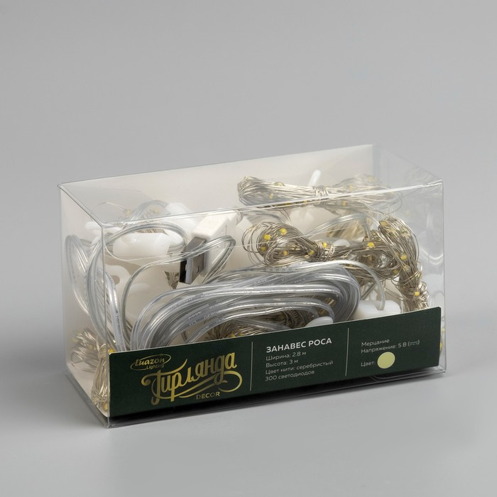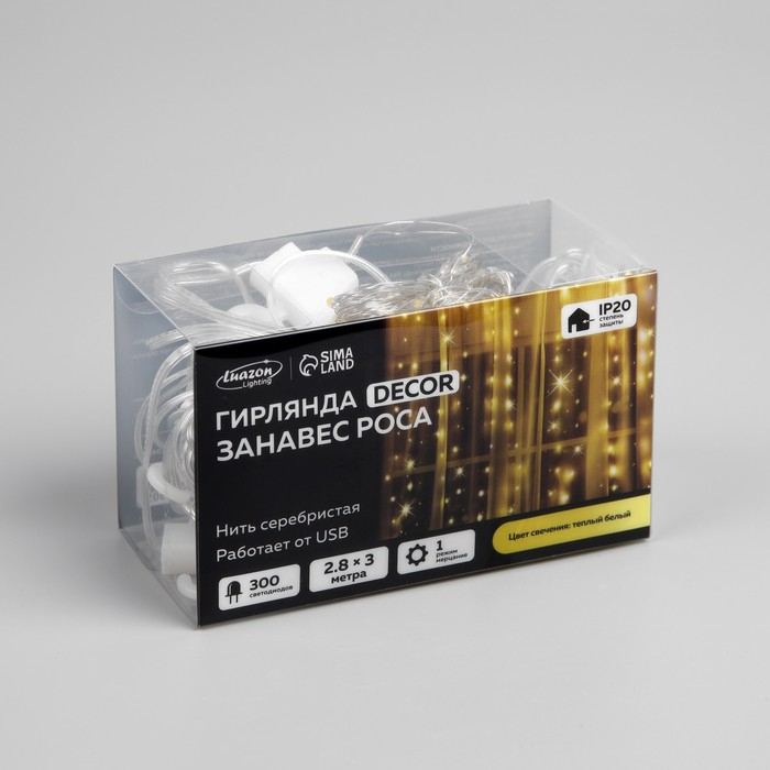 Гирлянда «Занавес» 2.8 × 3 м роса на крючках, IP20, серебристая нить, 300 LED, свечение тёплое белое, мерцание, USB