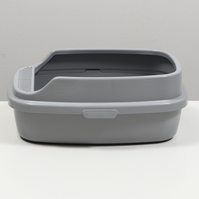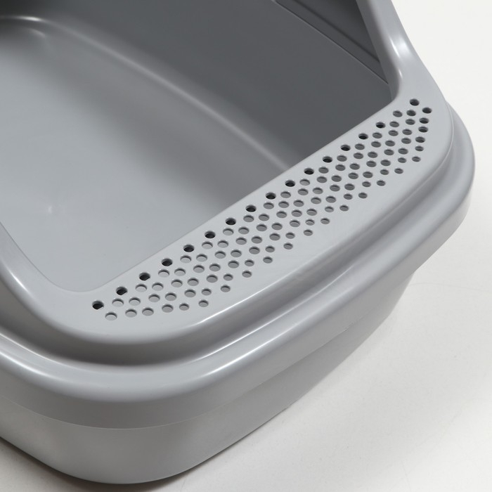 Лоток для кошек с высоким бортом сеткой, благодаря этому наполнитель не разбрасывается и пол остается чистым.