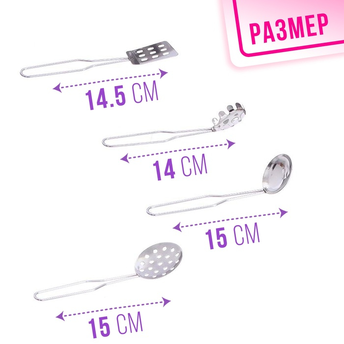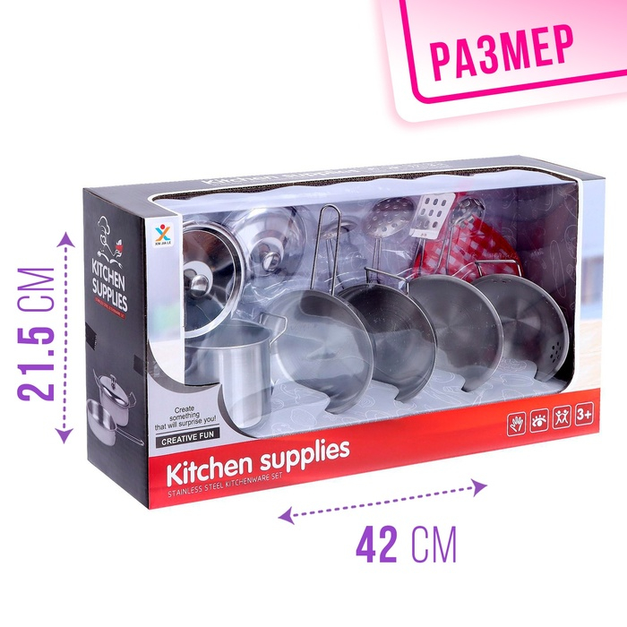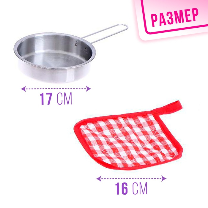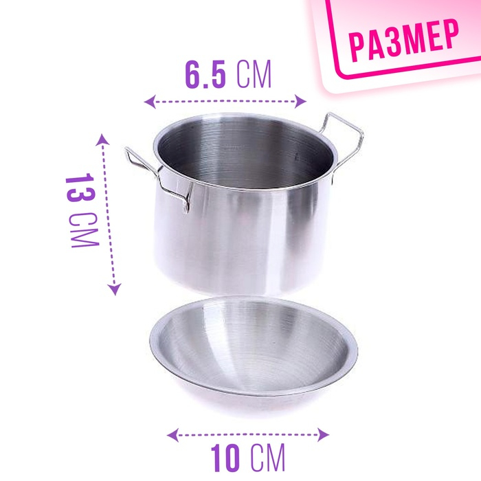 Набор металлической посуды — альтернатива взрослой кухонной утвари. В процессе игры малышка сможет абсолютно безопасно пользоваться принадлежностями для готовки: они лёгкие, простые в использовании, их размеры рассчитаны на ребёнка. Дочурка с удовольствием будет баловать свои игрушки кулинарными шедеврами, перенимая мамины рецепты.