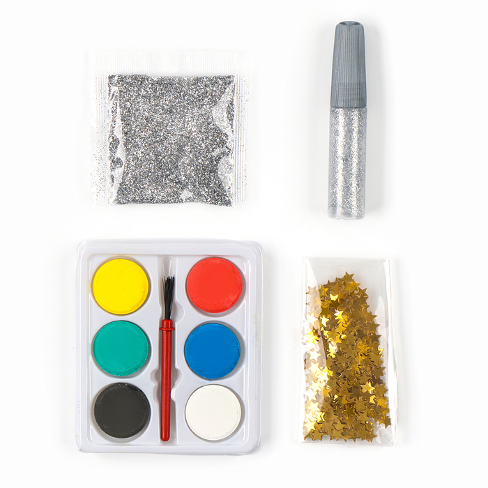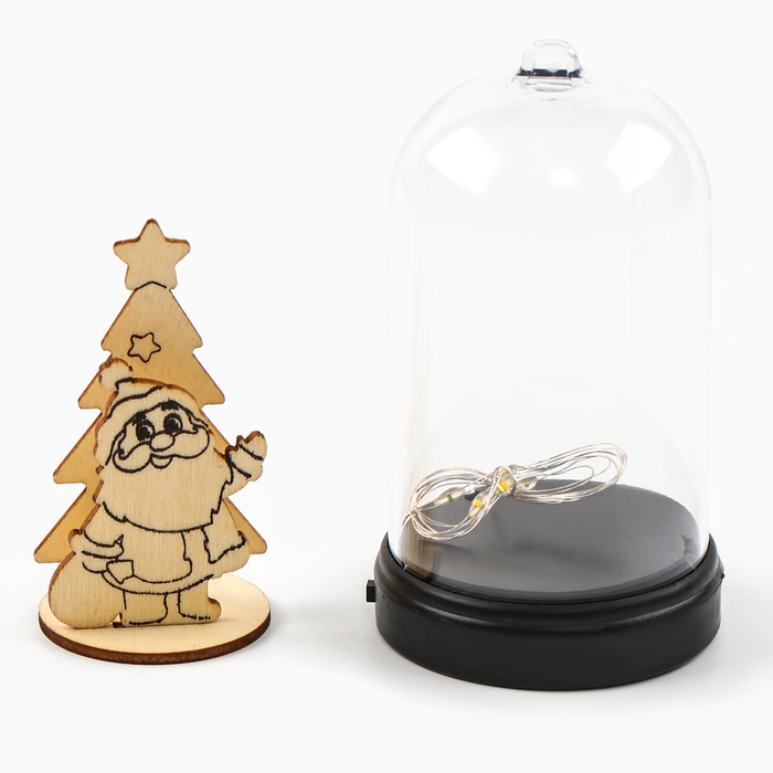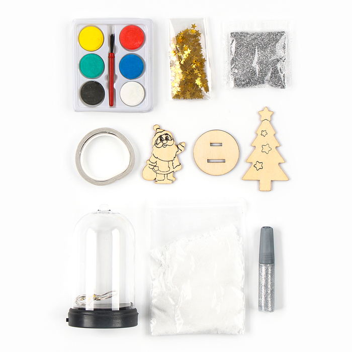 В наборе: купол, гирлянда, деревянная заготовка, краски, кисть, чудо-снег, блёстки.