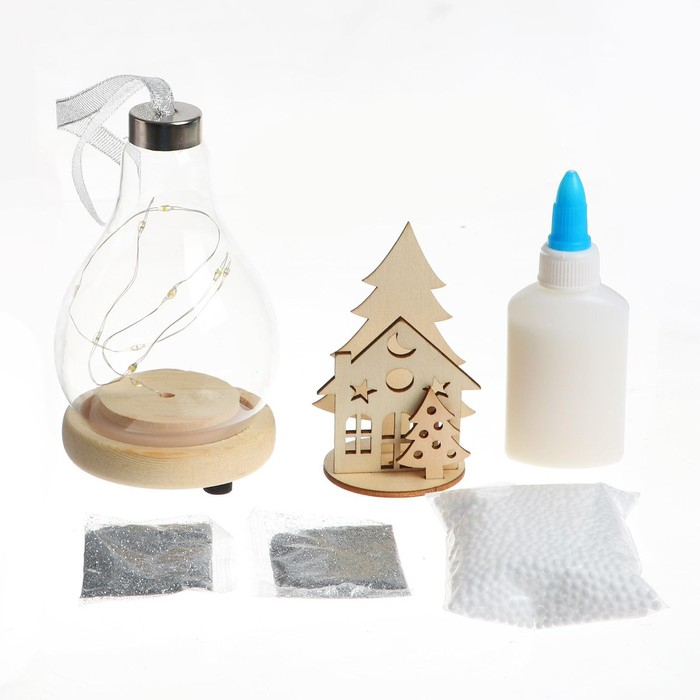 В наборе: основа, деревянная фигурка, клей, блёстки, декор, светящаяся гирлянда.