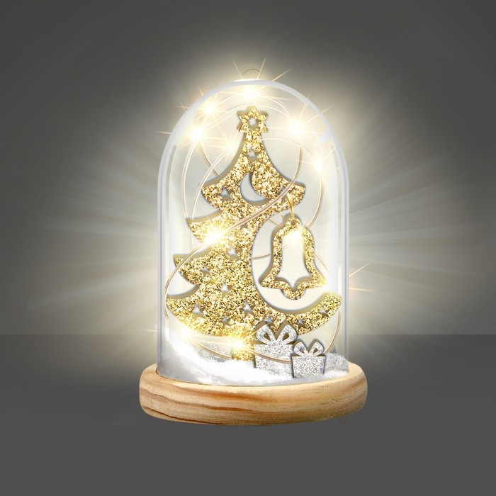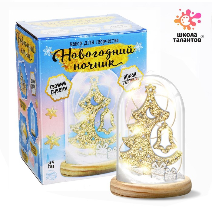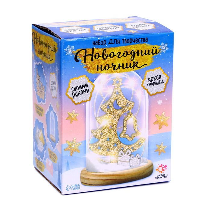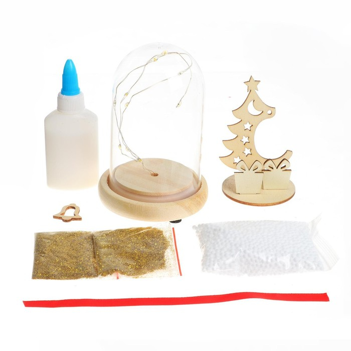 В наборе: основа, деревянная фигурка, клей, блёстки, декор, светящаяся гирлянда.