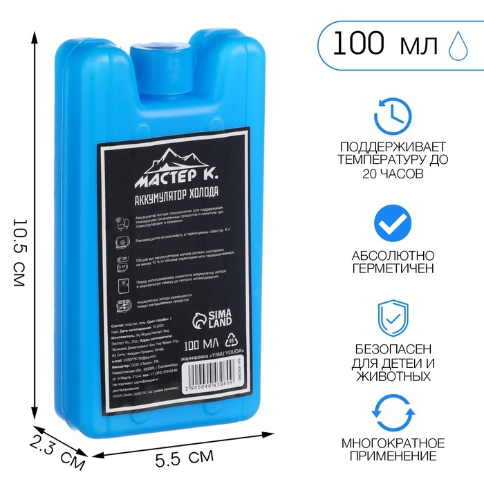 Аккумулятор холода гелевый "Мастер К", 100 мл, хладоэлемент для термосумок, 10.5 х 5.5 х 2.3 см 4043