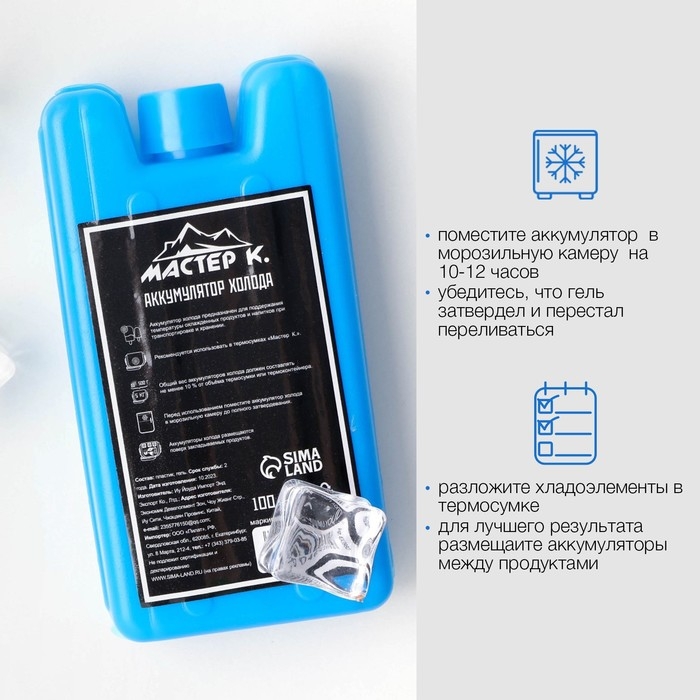 Аккумулятор холода - гелевый хладоэлемент для термосумки "Мастер К.", до 20 ч, 900 мл