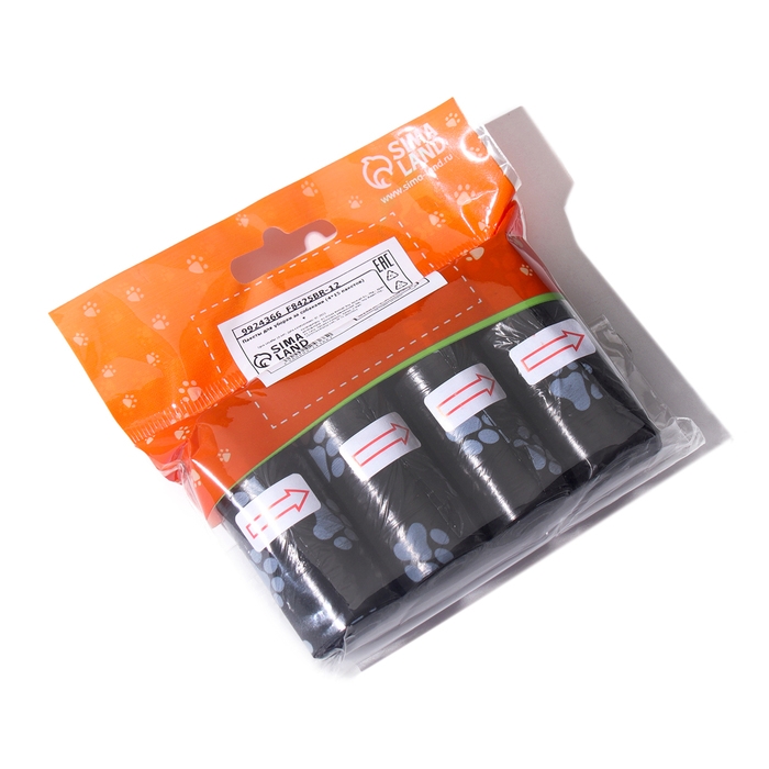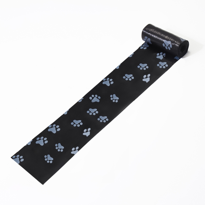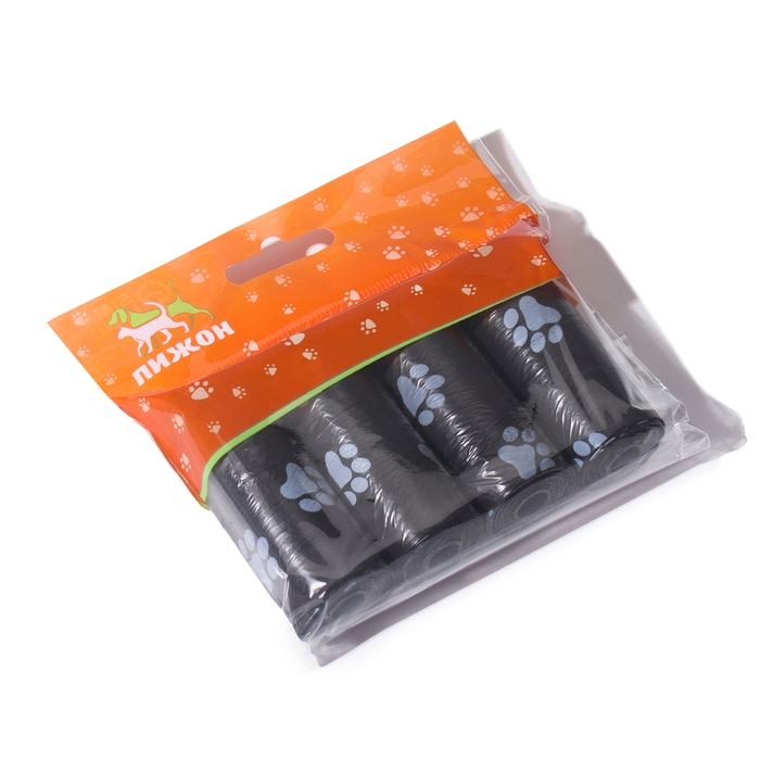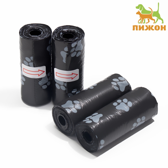 Пакеты для уборки за собаками с печатью "Лапки" (4 рулона по 15 пакетов 29х21 см), чёрный