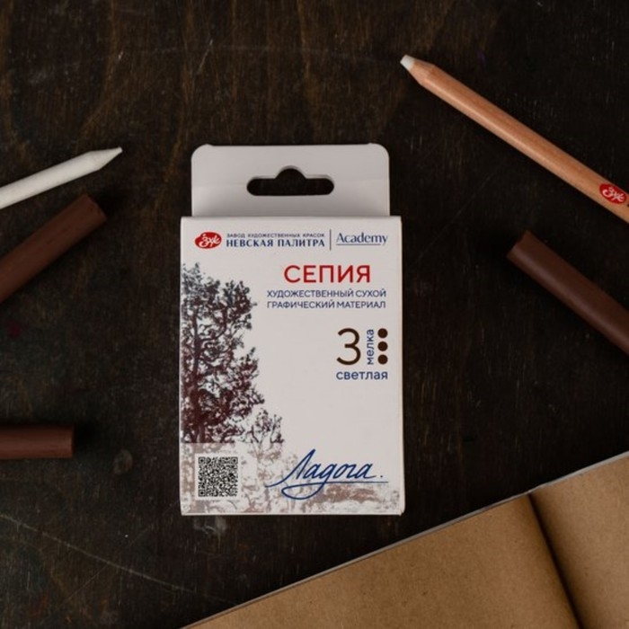 Сухой художественный материал сепия светлая предназначен для выполнения графических работ на бумаге, крафте, тонированной бумаге. Сепия светлая наносится штриховкой и легко растушёвывается по поверхности бумаги. Для внесения исправлений в рисунок сепия удаляется с поверхности бумаги стирательной резинкой, формопластом или клячкой. Для долговечного хранения завершенные работы требуют дополнительного закрепления лаком фиксативом. Длина стержня - 65 мм. Диаметр - 10 мм. Состав сепии светлой: наполнитель, пигмент, добавки. Гарантийный срок - 5 лет с даты изготовления. Хранить в сухом закрытом помещении, при температуре от 0 °С до 40 °С и относительной влажности воздуха не выше 60 %. Комплектация набора: сепия светлая 3 мелка, поролоновый ложемент, поролоновый защитный слой, картонная коробка с европодвесом. Производство ЗХК "Невская палитра".