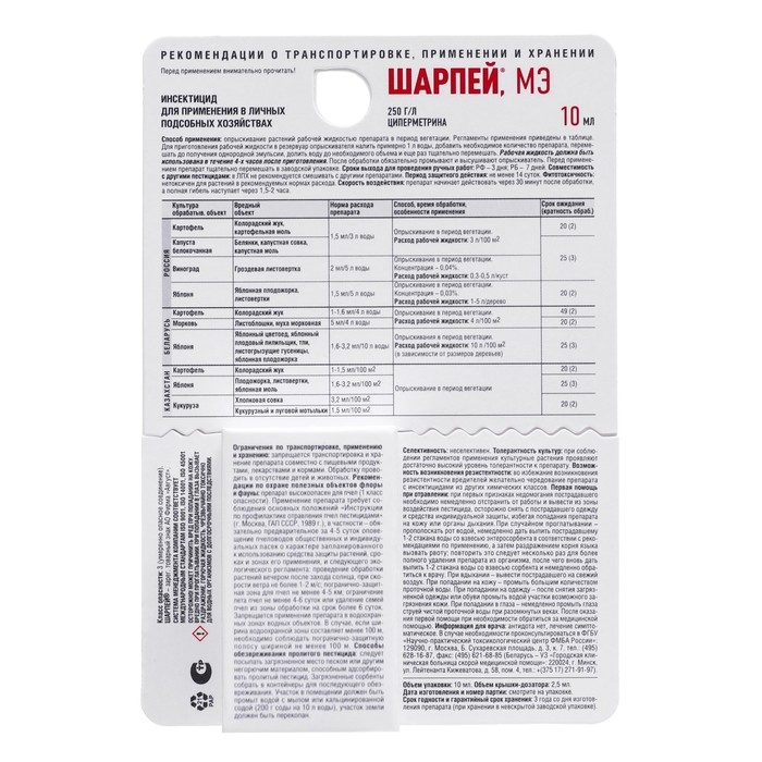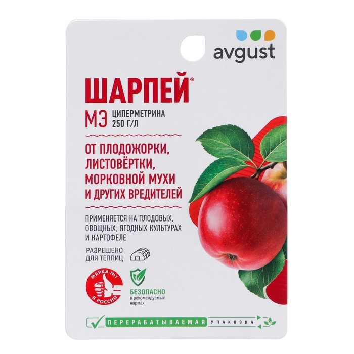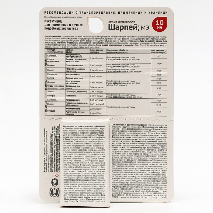 Шарпей обладает быстрым действием, поражает нервную систему вредных насекомых. В течение 10 - 15 минут после обработки они перестают передвигаться, а затем за 1,5 - 2 ч гибнут в результате общего паралича всех органов. В зависимости от вида вредителя, стадии его развития и погодных условий период защитного действия составляет от 7 до 14 дней. Таким образом, в течение 2 недель ваши растения защищены от насекомых, которые могут отродиться из яйцекладок, переместиться с соседних участков или с ваших необработанных культур.