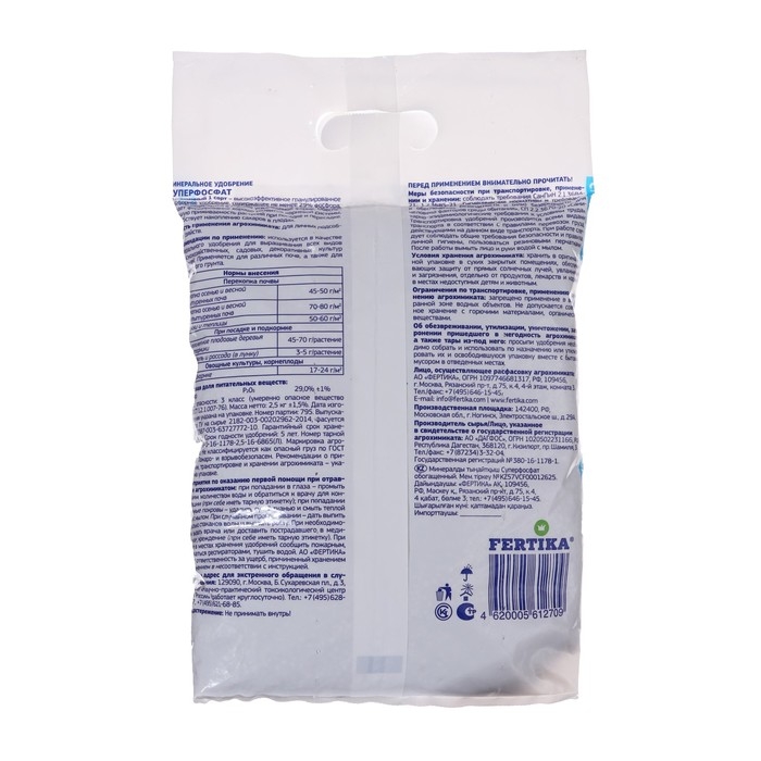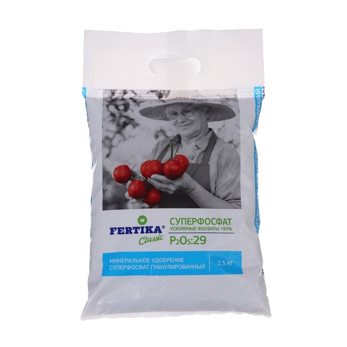 Удобрение Фертика «Суперфосфат» — универсальный минеральный состав для открытого и защищенного грунта. Вносится как основное удобрение перед посадкой и в качестве подкормки на протяжение периода вегетации. Имеет форму гранул. В состав входит фосфор, азот, калий, вспомогательные вещества — сера, магний, кальций. Оптимально для щелочной и нейтральной почвы. При внесении в кислую рекомендуется перемешивать с известняком или мелом. Используется для разных культур — овощных, плодово-ягодных, цветочных.Действие удобренияОбеспечивает развитие мощной корневой системы.Способствует повышению урожайности.Стимулирует скорейшее созревание.Улучшает качество и внешний вид плодов.
