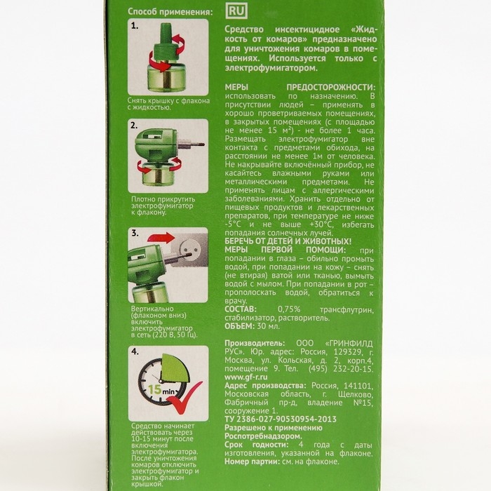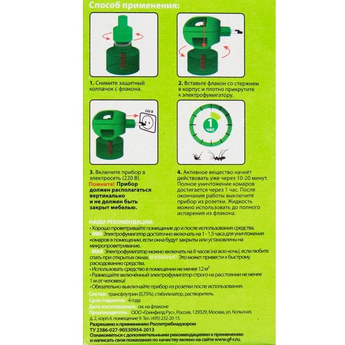 Жидкостный наполнитель 30 ночей. Жидкостный наполнитель для фумигатора - универсальное и удобное в использовании средство для борьбы с комарами. В помещении общим объемом около 60 кубических метров средство начинает работать уже через 15 минут. Для полного уничтожения комаров требуется приблизительно не более 1 часа. Средство выпускается в стандартном флаконе и подойдет для 99% приборов, предлагаемых на Российском рынке.
