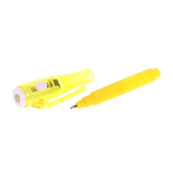 У волшебной ручки есть ещё одна функция — невидимые чернила. Снимите колпачок и напишите что-нибудь на листе бумаги, а затем посветите на надпись фонариком. Рисунок проявится.