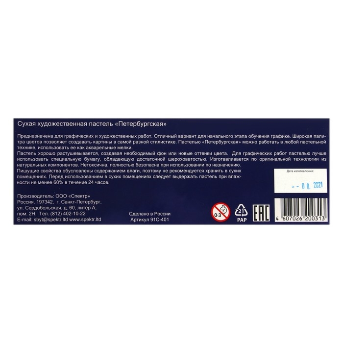 Пастель сухая "Петербургская" – достаточно мягкая, подходит для большинства типов пастельной бумаги. Круглый мелок хорошо растушевывается и смешивается, позволяя создавать новые оттенки. С мягкой сухой пастелью следует обращаться осторожно – мелки достаточно хрупкие, не любят сильный нажим и резкие движения.