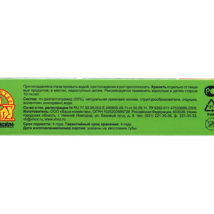 Состав: nn-диэтилтолуамид (25%), натуральная кремовая основа, структурообразователи, отдушка, аллантоин, консервант, вода.