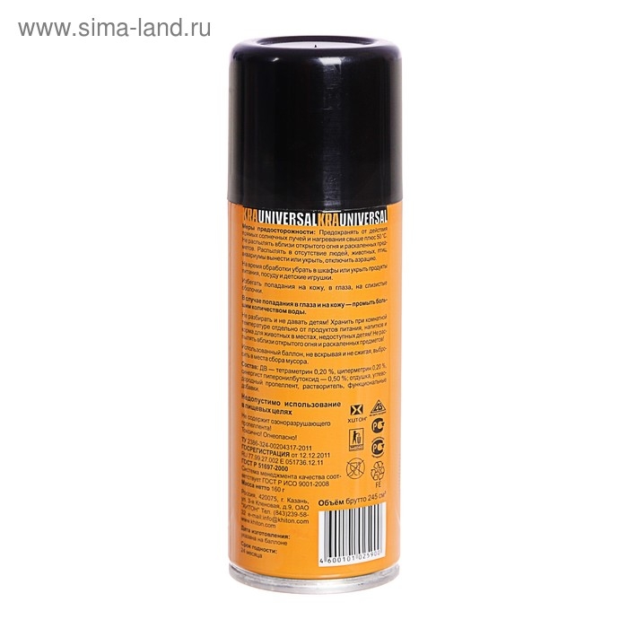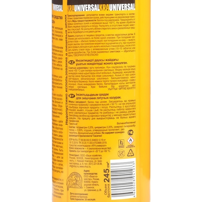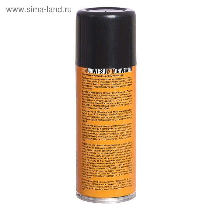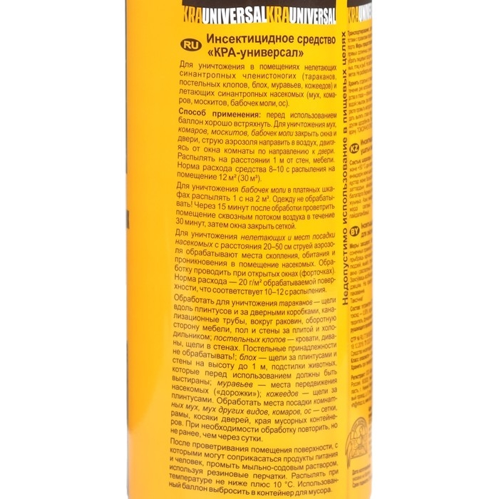 Средство инсектицидное «КРА-универсал». Предназначено для уничтожения в помещениях нелетающих синантропных членистоногих (тараканов, постельных клопов, блох, муравьев, кожеедов) и летающих синантропных насекомых (мух, комаров, москитов, бабочек моли, ос).