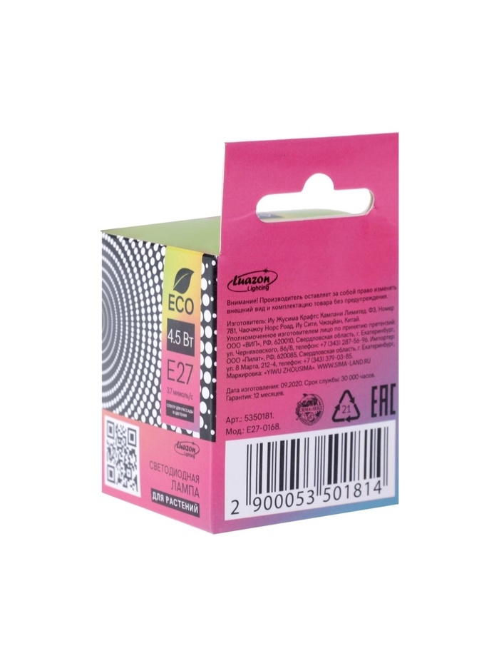 Фитолампа для растений Luazon, светодиодная, E27, 4.5 Вт, IP44, 220 В, 270°, биколорная