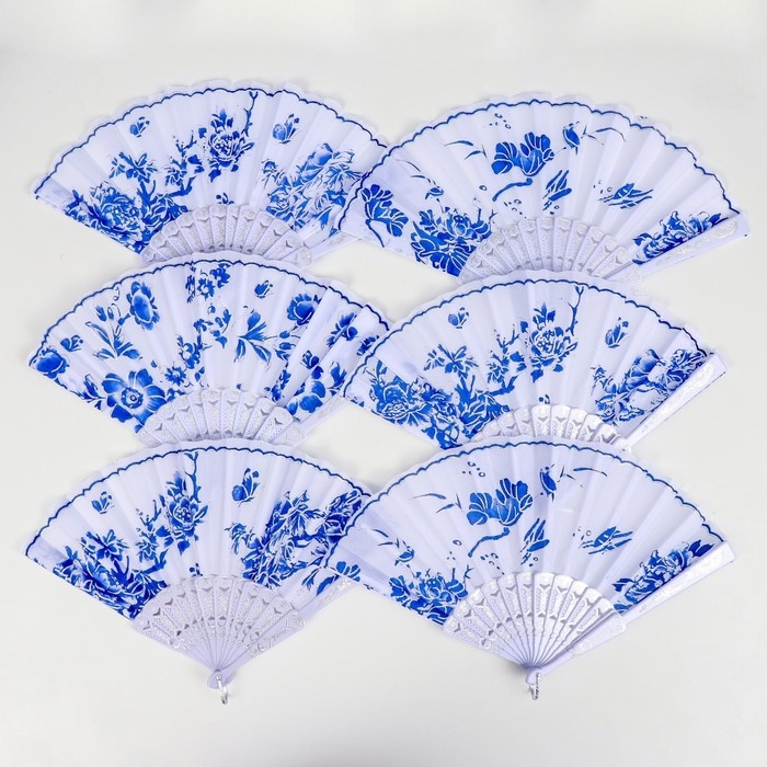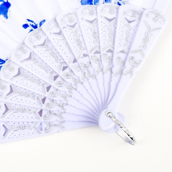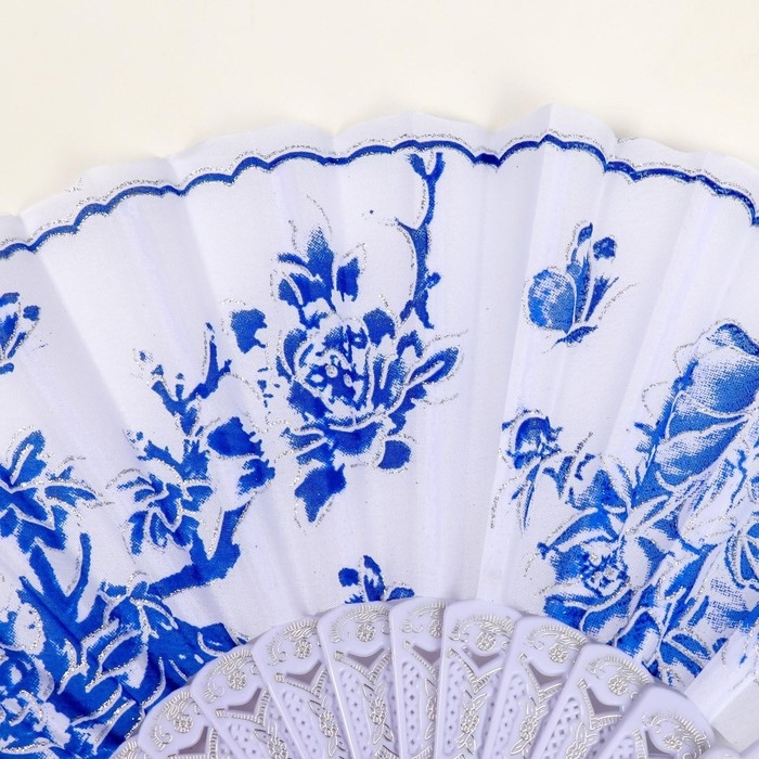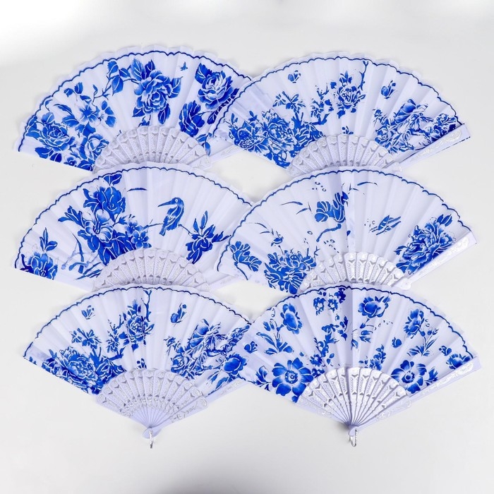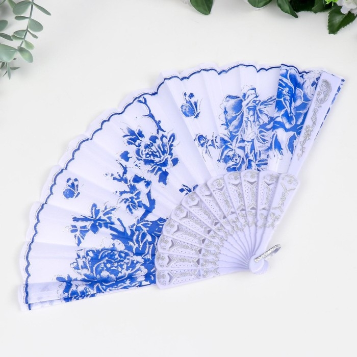 Веер пластик, текстиль "Синий рисунок на белом" МИКС 23 см