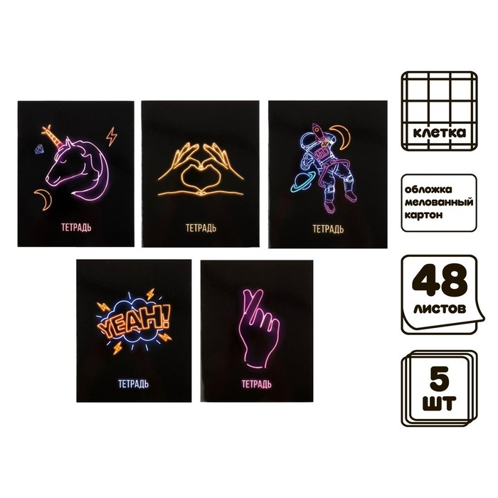 Комплект тетрадей из 5 штук, 48 листов в клетку Calligrata "Neon", обложка мелованный картон, УФ-лак, блок офсет