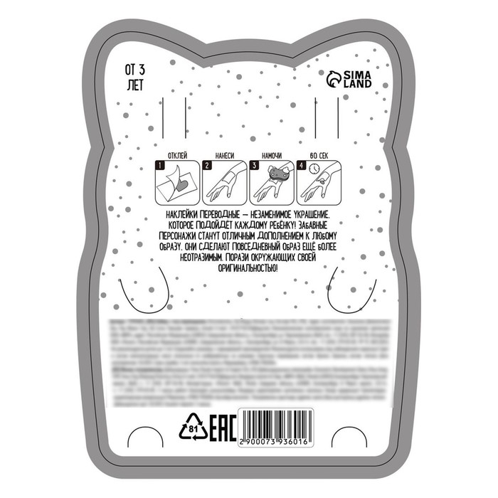 Внимание! Возможна индивидуальная реакция на участке нанесения татуировки. Рекомендуем следить за состоянием кожи в период использования. После снятия татуировки промойте кожу водой и нанесите тонкий слой увлажняющего крема.