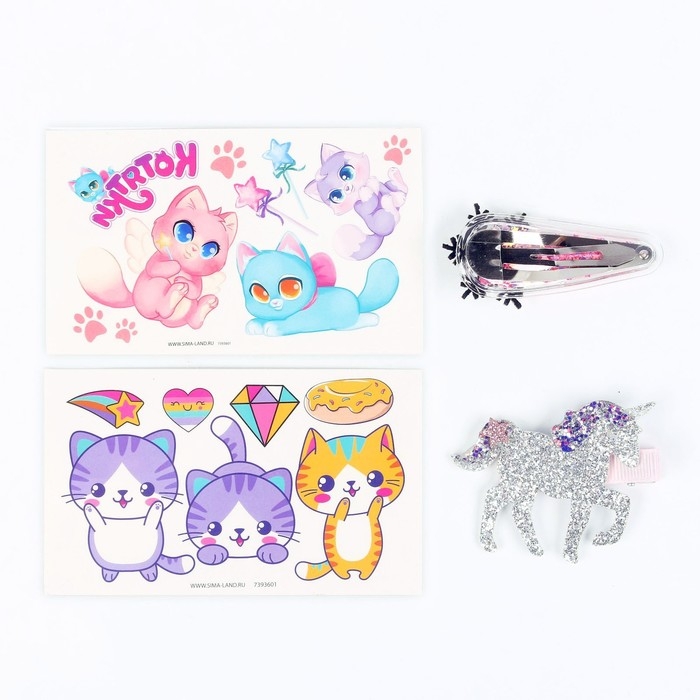 Бьюти-набор понравится каждой девочке. Внутри малышка найдёт лист с тату-переводками и модные аксессуары для волос.
