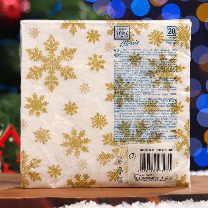 Новогодние салфетки бумажные Home Classic «Золотые снежинки», 3 слоя, 33x33 см, 20 шт
