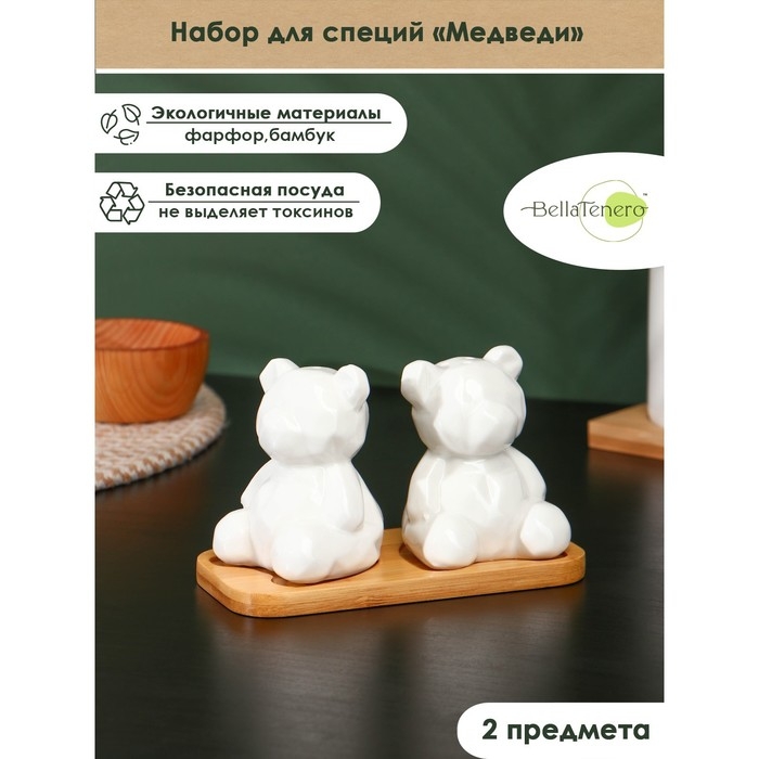 Набор для специй BellaTenero «Медведи» изготовлен из качественного фарфора. Кухонные изделия из фарфора отличаются прочностью и надёжностью, устойчивы к появлению царапин и резким перепадам температур. Благодаря оригинальному дизайну и причудливым формам набор отлично впишется в интерьер вашей кухни и станет настоящей изюминкой при сервировке.