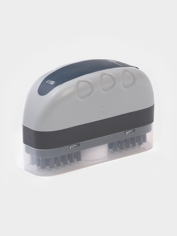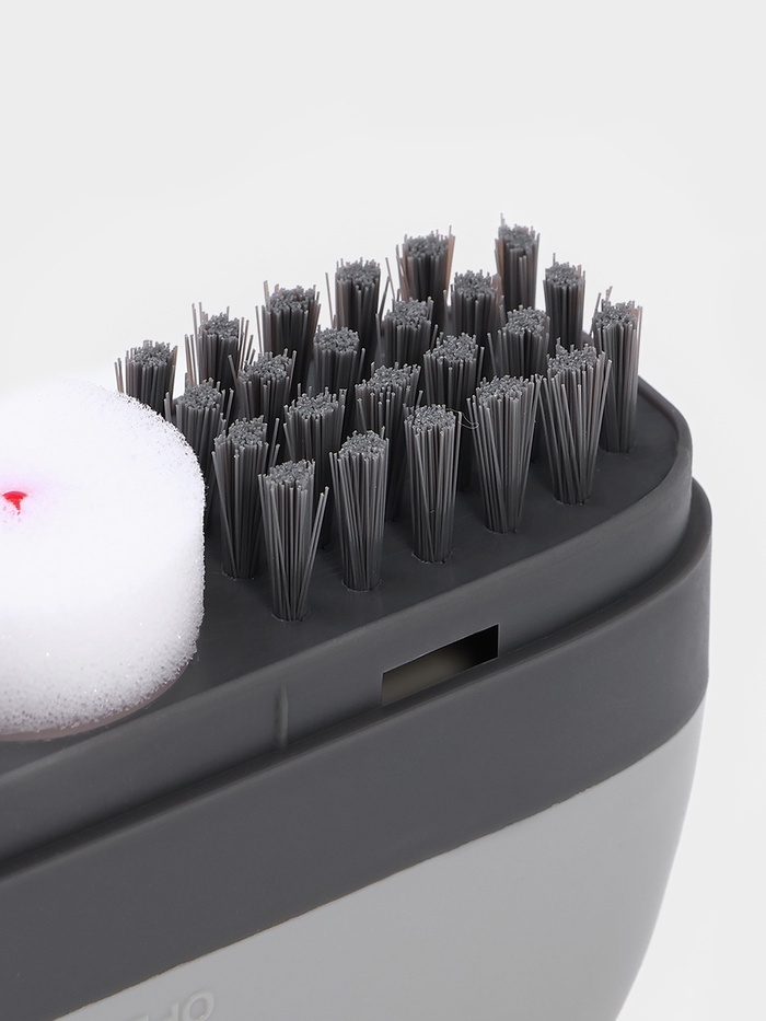 - Удобный механизм: нажатие на губку активирует подачу моющего средства, которое равномерно распределяется по поверхности обуви.