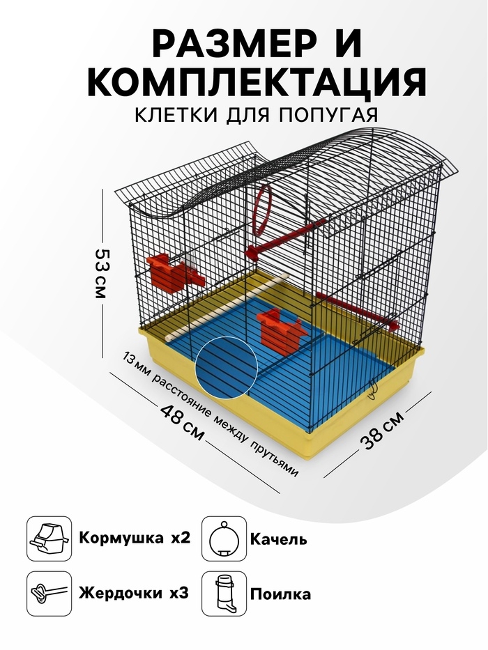 Клетка также оборудована специальным поддоном, облегчающим процесс уборки, а удобная ручка максимально упрощает транспортировку изделия.