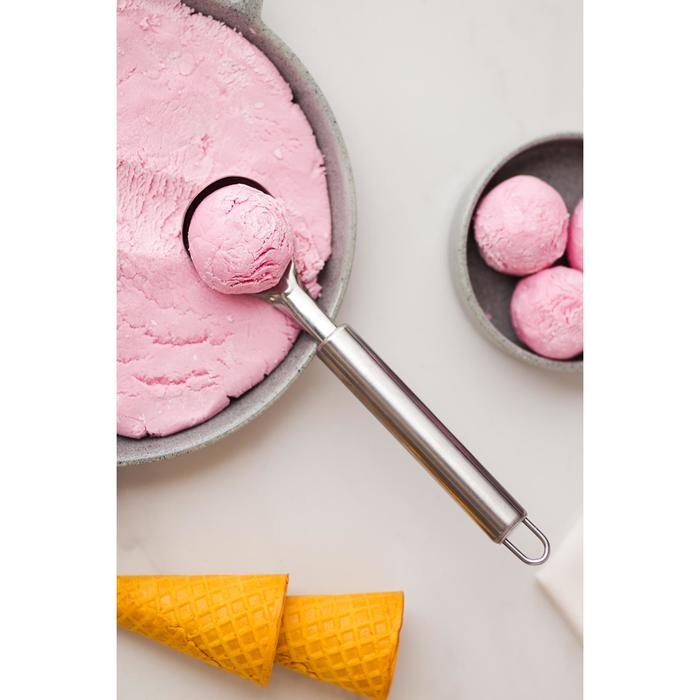 - Специальный прибор из нержавеющей стали позволяет удобно черпать замороженную массу и выкладывать ее аккуратными шарами.