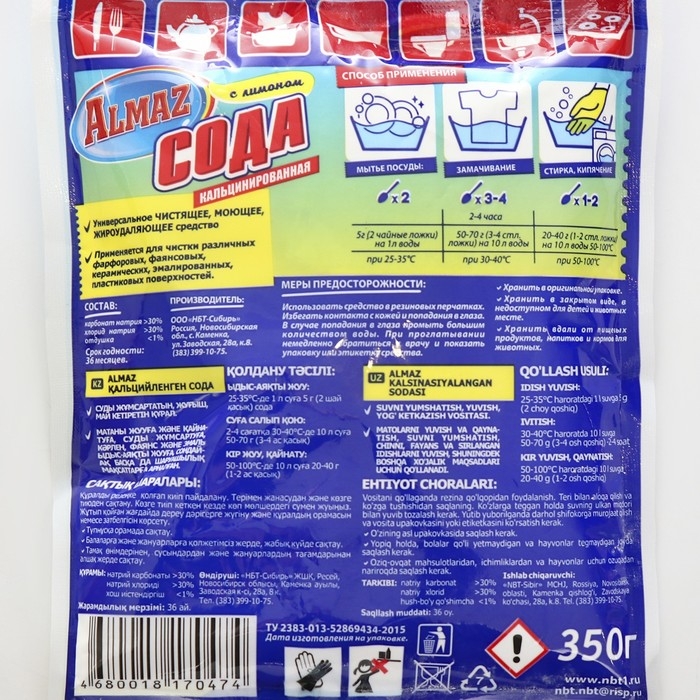 Алмаз Сода кальцинированная универсальное чистящее и моющее средство. Применяется для мытья фарфора, фаянсовой и эмалированной посуды. Эффективно удаляет загрязнения с электрической плиты, духовки, гриля, микроволновой печи, вытяжки и т.д. Незаменим для мытья раковин, душевых кабин, кафеля, ванн и унитазов, удаляя въевшуюся грязь и другие трудновыводимые загрязнения. Не содержит фосфатов, является естественной добавкой для стирального порошка, так же может полностью его заменить, смягчает воду, не раздражает кожу.