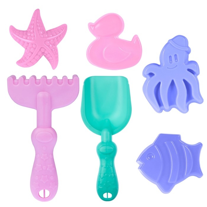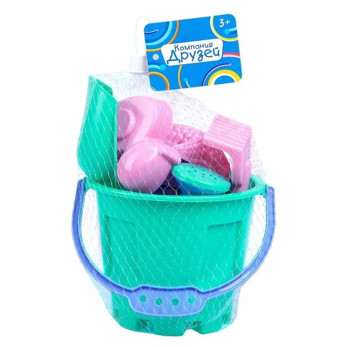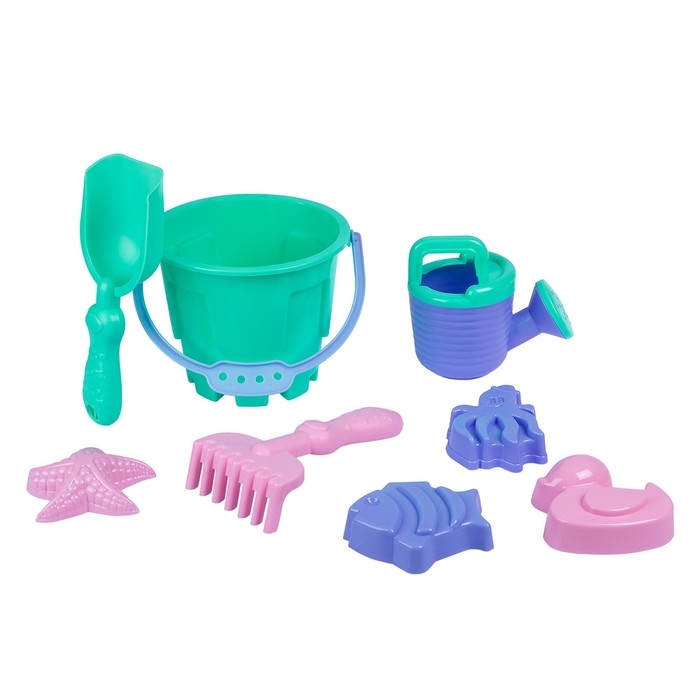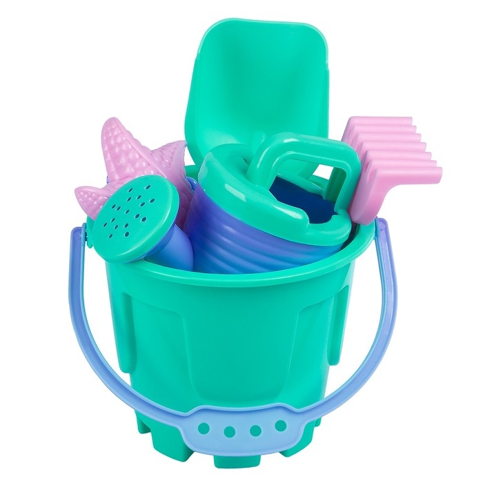 Песочный набор: ведро 1,2 л, лопатка,грабли,4 формочки, лейка 0,2 л, бирюзово-розовый