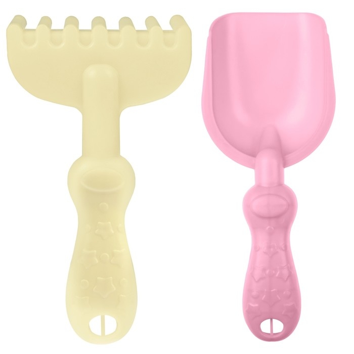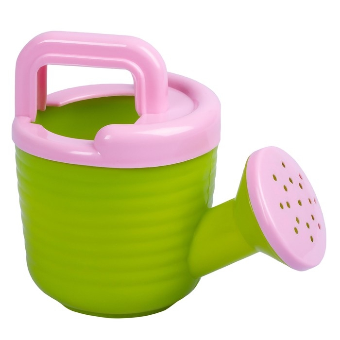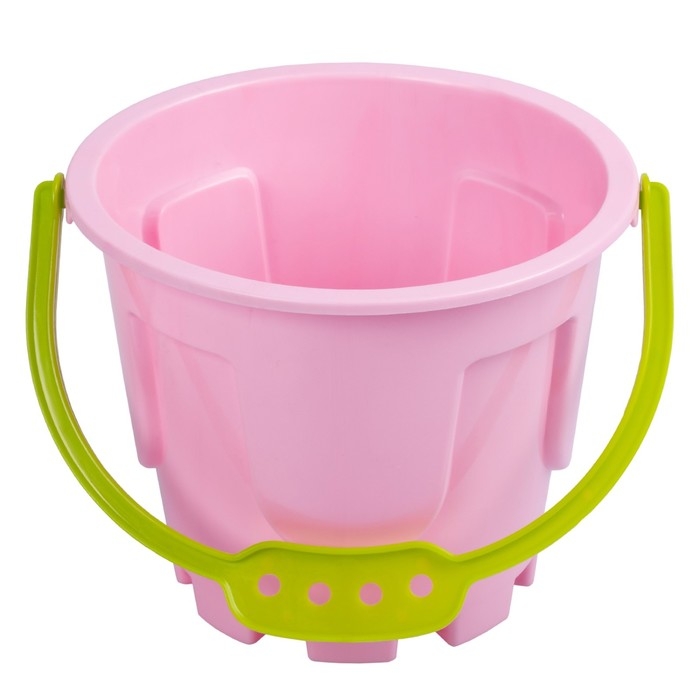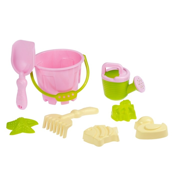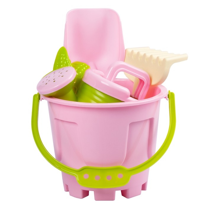 Песочный набор: ведро 1,2 л, лопатка, грабли, 4 формочки, лейка 0,2 л, розово-салатовый