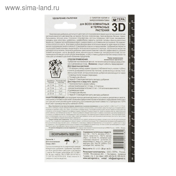 Удобрение "Гера 3D" для всех комнатных и террасных растений с гуматом калия, палочки, 60 г
